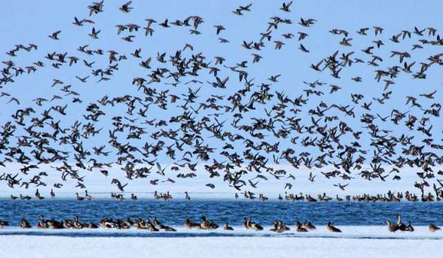 在雁窩島國(guó)家級(jí)生態(tài)濕地自然保護(hù)區(qū)內(nèi)的冰面上,白鸛、灰鸛還有小水雞,三五一組,有的悠閑散步,有的仰頭眺望,有的在融化的雪水中覓食,還有的在低空盤(pán)旋。比往年提前10天到來(lái)的候鳥(niǎo),為雁窩島增添了初春的氣息和生機(jī)。