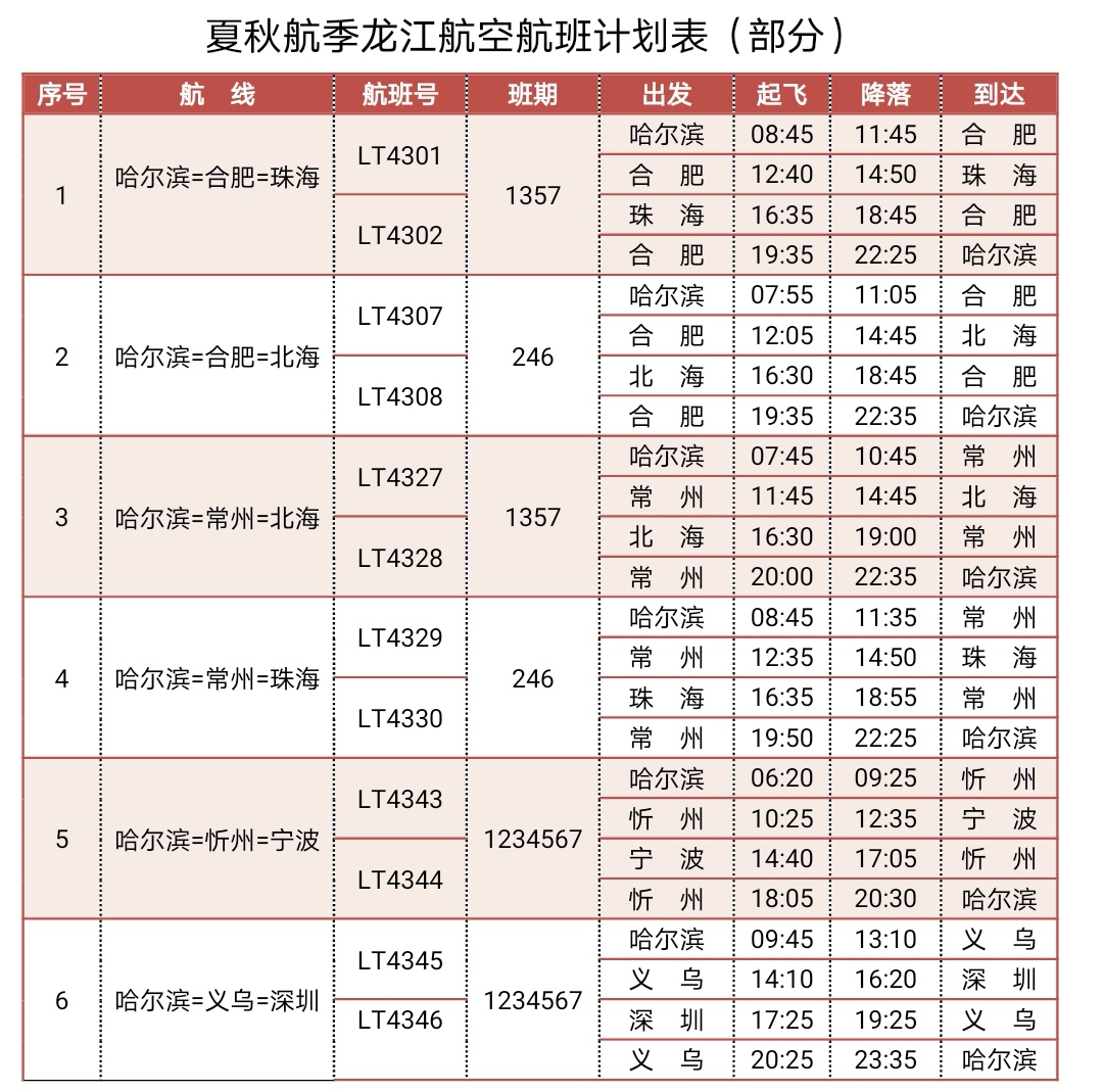 哈爾濱—合肥—珠海航線航班號(hào)為L(zhǎng)T4301/2,每周一、三、五、日?qǐng)?zhí)行4班;哈爾濱—合肥—北海航線航班號(hào)為L(zhǎng)T4307/8,每周二、四、六執(zhí)行3班;哈爾濱—常州—北海航線航班號(hào)為L(zhǎng)T4327/8,每周一、三、五、日?qǐng)?zhí)行4班;哈爾濱—常州—珠海航線航班號(hào)為L(zhǎng)T4329/30,每周二、四、六執(zhí)行3班;哈爾濱—忻州—寧波航線航班號(hào)為L(zhǎng)T4343/4,每天一班;哈爾濱—義烏—深圳航線航班號(hào)為L(zhǎng)T4345/6,每天一班。