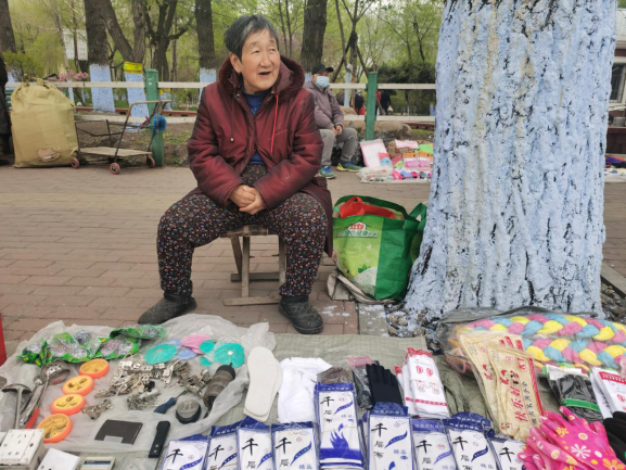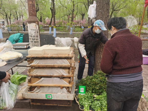 早市的吸引力在于“看”。早市上,各攤主會想各種各樣的方式招攬顧客,有的會用廣告牌,有的會吆喝。早市上的商業(yè)運(yùn)作方式也非常有趣,比如現(xiàn)場擠羊奶,旁邊拴幾頭奶羊,當(dāng)招牌;賣刀切面的現(xiàn)場切,炸油條的現(xiàn)場炸,都是明檔手工,這幾乎是大多數(shù)早市商家的促銷手段。也有推銷老花鏡的,賣衣服的,會現(xiàn)場吆喝“正宗商品專柜,清倉促銷”——這大概是現(xiàn)在“直播帶貨”的線下模式。住在早市附近的居民,有的會在樓上用繩子吊下個籃子,讓攤主把東西放到籃子里,直接拽上去。