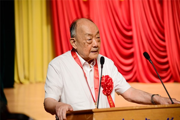 大會(huì)為“光榮在黨50年”的老黨員代表頒發(fā)紀(jì)念章,楊士莪院士作為黨齡56年的老黨員,發(fā)表了獲獎(jiǎng)感言,他說(shuō),“我們這批在黨的關(guān)懷和培養(yǎng)教育下成長(zhǎng)起來(lái)的一代,在黨的百年生日的時(shí)候,說(shuō)實(shí)話(huà)心里千言萬(wàn)語(yǔ)不知從何說(shuō)起,要不然我就唱兩句現(xiàn)在電視上經(jīng)常聽(tīng)到的歌曲?!睏钤菏可钋槌憽冻礁杞o黨聽(tīng)》,他說(shuō):“我的聲音雖然不好聽(tīng),但是這首歌能夠表達(dá)我的心意。唱支山歌給黨聽(tīng),我把黨來(lái)比母親……”。楊士莪院士的歌聲讓在場(chǎng)師生非常意外,這首沒(méi)有經(jīng)過(guò)彩排的歌曲,卻因真情實(shí)感走進(jìn)了師生們的心里,在他的帶動(dòng)下,在場(chǎng)師生也情不自禁地鼓掌打拍跟唱起《唱支山歌給黨聽(tīng)》,“母親只生了我的身,黨的光輝照我心?!?/span>