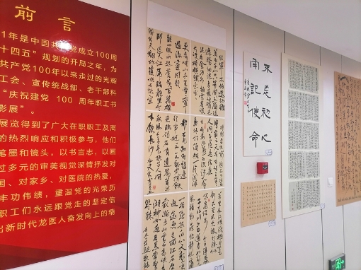 據(jù)了解,此次活動共入展攝影作品41幅、書法作品15幅、繪畫作品13幅、手工制作5件、詩歌2首及微視頻4部,其中部分作品在該院門診五樓進(jìn)行了展示。攝影作品《守護(hù)》,作者是省醫(yī)院兒科副主任汪琪,通過鏡頭展現(xiàn)了醫(yī)務(wù)工作者的日常忙碌,及不知疲倦、一絲不茍的內(nèi)心世界;書法作品《紅船精神》,作者是省醫(yī)院南崗院區(qū)泌尿外一科主任楚寧,筆法嫻熟、清秀雋永,字里行間體現(xiàn)出堅定理想、百折不撓的奮斗精神;書法作品《不忘初心》聯(lián)句,作者是省醫(yī)院南崗院區(qū)普外科姜峰奇,古樸自然,一顆紅心永向黨;繪畫作品《一唱雄雞天下白》,作者是省醫(yī)院退休老干部張克起,作品直接用畫面抒發(fā)革命浪漫主義情懷;繪畫作品《江山多嬌》,作者是省醫(yī)院退休老職工賈雨虹,用嬌美的花朵為黨的百年華誕獻(xiàn)禮。