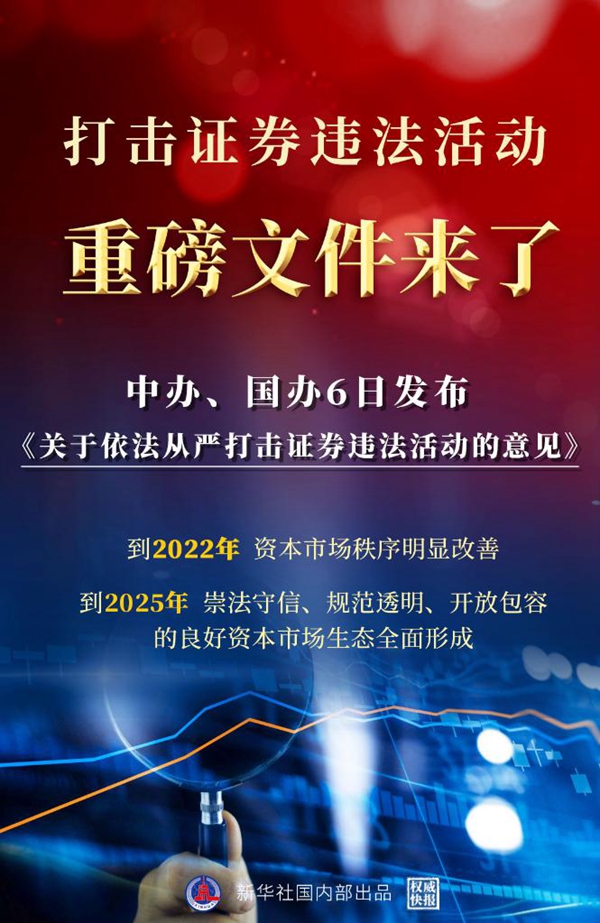 新華社北京7月6日電(記者張千千 劉慧)中共中央辦公廳、國務(wù)院辦公廳6日公開發(fā)布了《關(guān)于依法從嚴(yán)打擊證券違法活動的意見》,對建立健全資本市場執(zhí)法司法體制機(jī)制、依法從嚴(yán)打擊證券違法活動、推動資本市場高質(zhì)量發(fā)展作出重要部署。