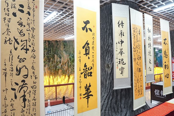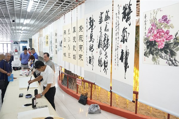 挽袖、研墨、調(diào)色、揮毫,書畫家們進行現(xiàn)場書畫創(chuàng)作并交流創(chuàng)作心得。以書言志、以畫寄情,一幅幅極富感染力的書法、繪畫作品,抒發(fā)了對黨的敬愛之情和對祖國的美好祝愿?;顒蝇F(xiàn)場共展出書畫作品百余件。