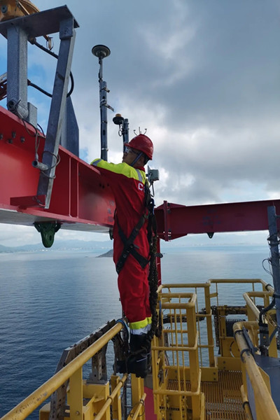 北斗導(dǎo)航設(shè)備除了在中央控制室安裝的北斗 /GNSS 海洋參考位置終端,還需要在鉆井平臺頂部安裝信號接收等設(shè)備。天線布設(shè)的位置、方向、高度等因素都會影響定位系統(tǒng)的精度,為了實現(xiàn)系統(tǒng)的標(biāo)準(zhǔn)化安裝,團隊成員“親自上陣”選點、布設(shè)、安裝。在接受安全操作相關(guān)培訓(xùn)后,近 20 人次攜帶安全設(shè)備攀爬高度 137 米的平臺井架,進行天線安裝及線纜布設(shè)。