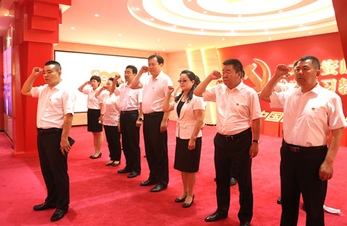 在地區(qū)黨史學(xué)習(xí)教育展館,面對鮮紅的黨旗,新林區(qū)委書記領(lǐng)誓,區(qū)委理論學(xué)習(xí)中心組成員集體宣誓,重溫入黨誓詞,砥礪前進(jìn)初心,勇?lián)氊?zé)使命。