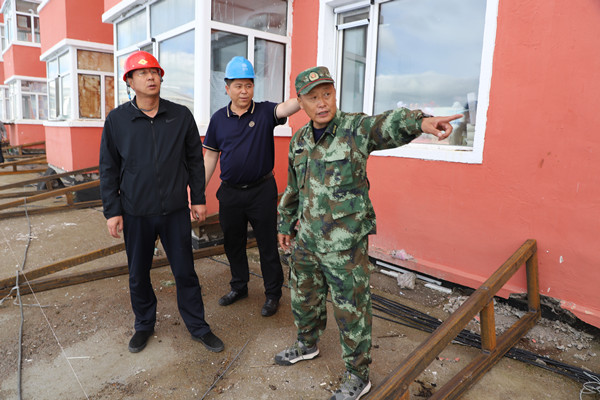 林業(yè)局黨委副書記、局長(zhǎng)韓鳳泉(左一)登上莓苑小區(qū)3號(hào)樓,了解安裝鐵皮瓦防止一樓漏水情況。