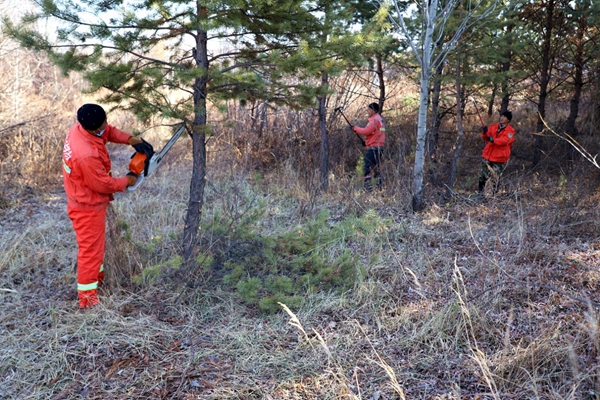 圖為阿木爾林業(yè)局防火辦黨總支黨員突擊隊(duì)帶領(lǐng)專(zhuān)業(yè)撲火隊(duì)員在修剪北極植物園樹(shù)枝(王力/攝)