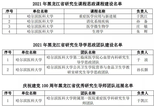 黑龍江經(jīng)濟(jì)網(wǎng)訊(黑龍江日?qǐng)?bào)全媒體見習(xí)記者董廣碩 商祺)為貫徹落實(shí)國家《關(guān)于全面落實(shí)研究生導(dǎo)師立德樹人職責(zé)的意見》《高等學(xué)校課程思政建設(shè)指導(dǎo)綱要》《關(guān)于加快新時(shí)代研究生教育改革發(fā)展的意見》精神,按照《關(guān)于加快新時(shí)代黑龍江省研究生教育改革發(fā)展的實(shí)施意見》要求,日前,經(jīng)全省研究生培養(yǎng)單位遴選推薦,黑龍江省研究生課程思政教育聯(lián)盟專家委員會(huì)評(píng)審,省學(xué)位委員會(huì)、省教育廳批準(zhǔn),哈爾濱醫(yī)科大學(xué)共有26個(gè)項(xiàng)目獲批省級(jí)立項(xiàng),其中研究生課程思政課程建設(shè)項(xiàng)目4個(gè)、研究生導(dǎo)學(xué)思政團(tuán)隊(duì)(導(dǎo)師)建設(shè)項(xiàng)目2個(gè)、研究生課程思政案例19個(gè),慶祝建黨100周年巡展優(yōu)秀研究生導(dǎo)師團(tuán)隊(duì)1支。
