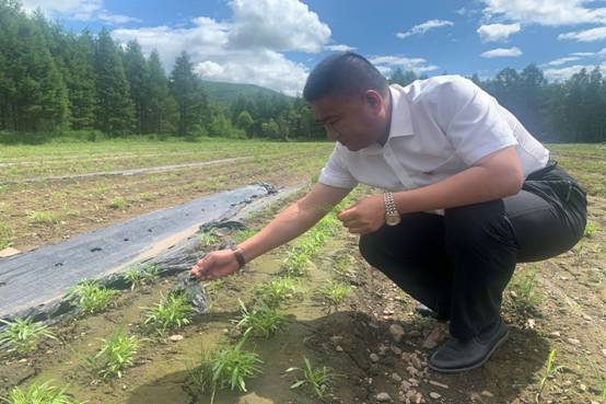 圖為關(guān)成國(guó)在古源林場(chǎng)興安雪菊種植基地查看雪菊長(zhǎng)勢(shì)情況(魏樹(shù)強(qiáng)/攝)