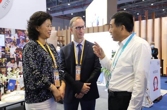 李軍、陳昱兩位集團公司領導走進北極冰藍莓酒莊設立在法國FIWA的站臺,向FIWA國際大獎賽主席、法國國際品評鑒定酒類專家協(xié)會主席奧利維耶·布什,以及法國FIWA SAS股份有限公司總裁張莉推介了參展的藍莓冰酒、藍莓雪酒等產品在剛剛結束的義烏森博會受到客戶青睞情況,尤其是重點介紹了大興安嶺地處祖國最北方,日照時間長,晝夜溫差大,天然純降水,生長出野生藍莓具有花青素含量高的特點,其產品藍莓冰酒、藍莓白蘭地等在法國國際葡萄酒大獎賽、有機葡萄酒大獎賽和烈酒大獎賽上斬獲大金獎、金獎。