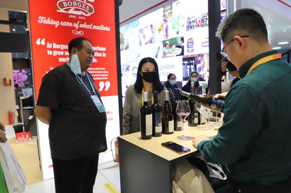 圖為大興安嶺林業(yè)集團公司黨委副書記、總經理李軍(左二)向法國參展企業(yè)推介北極冰藍莓酒莊紅酒系列產品(王力/攝)