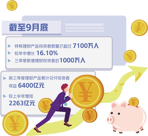 而且,隨著居民財富的不斷積累,投資者的理財意識顯著增強(qiáng),銀行理財投資者人數(shù)持續(xù)增長,截至9月底,持有理財產(chǎn)品投資者數(shù)量已超過7100萬人,較年中增長16.10%,僅三季度新增理財投資者近1000萬人。在轉(zhuǎn)型過程中,理財產(chǎn)品的投資收益也穩(wěn)中有升,前三季度理財產(chǎn)品累計兌付投資者收益6400億元,較上半年增加2263億元。