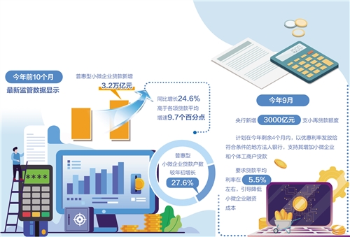 最新監(jiān)管數(shù)據(jù)顯示,今年前10個(gè)月,普惠型小微企業(yè)貸款新增3.2萬(wàn)億元,同比增長(zhǎng)24.6%,高于各項(xiàng)貸款平均增速9.7個(gè)百分點(diǎn);普惠型小微企業(yè)貸款戶數(shù)較年初增長(zhǎng)27.6%。