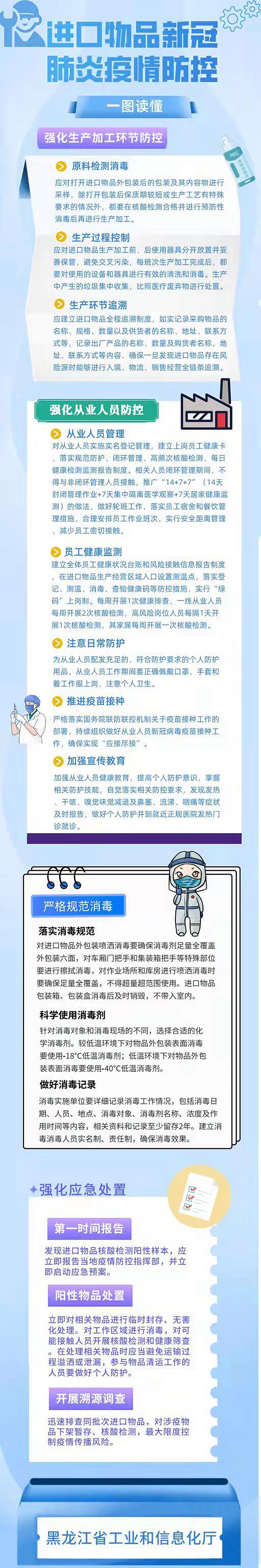 公開(kāi)信表示,近期疫情反彈形勢(shì)嚴(yán)峻復(fù)雜,為確保工業(yè)企業(yè)不發(fā)生聚集性疫情,共同構(gòu)筑疫情防控堅(jiān)固防線,提示:涉及進(jìn)口物品加工、使用的工業(yè)企業(yè)要嚴(yán)格按照《黑龍江省進(jìn)口物品新冠肺炎疫情風(fēng)險(xiǎn)防控工作方案》落實(shí)各項(xiàng)防疫措施。一要強(qiáng)化生產(chǎn)加工環(huán)節(jié)的防控。生產(chǎn)前做好原料檢測(cè)消毒,生產(chǎn)中做好過(guò)程控制,設(shè)備和器具進(jìn)行有效的清洗和消毒避免交叉污染,產(chǎn)生的垃圾集中收集,比照醫(yī)療廢棄物進(jìn)行處置。建立進(jìn)口物品全程追溯制度,確保一旦發(fā)現(xiàn)進(jìn)口物品存在風(fēng)險(xiǎn)源時(shí)能夠進(jìn)行入境、物流、銷售經(jīng)營(yíng)全鏈條追溯。二要強(qiáng)化從業(yè)人員防控。對(duì)員工實(shí)施實(shí)名登記管理,做好員工健康監(jiān)測(cè)和核酸檢測(cè),合理安排作業(yè)班次,減少密切接觸。配發(fā)充足并符合防護(hù)要求的個(gè)人防護(hù)用品,加強(qiáng)員工健康教育,提高個(gè)人防護(hù)意識(shí)。嚴(yán)格落實(shí)當(dāng)?shù)仃P(guān)于疫苗接種工作的部署,持續(xù)組織做好員工新冠病毒疫苗接種工作,確保實(shí)現(xiàn)“應(yīng)接盡接”。三要嚴(yán)格規(guī)范消毒。對(duì)進(jìn)口物品外包裝、加工場(chǎng)所、車廂門把手和集裝箱把手等要嚴(yán)格按照規(guī)范消毒,消毒時(shí)要確保足量全覆蓋并針對(duì)消毒對(duì)象和消毒現(xiàn)場(chǎng)的不同選擇合適的化學(xué)消毒劑。詳細(xì)記錄消毒工作情況,建立消毒人員實(shí)名制、責(zé)任制,確保消毒效果。四要強(qiáng)化應(yīng)急處置。發(fā)現(xiàn)進(jìn)口物品核酸監(jiān)測(cè)陽(yáng)性樣本,應(yīng)立即報(bào)告當(dāng)?shù)匾咔榉揽刂笓]部,并同步啟動(dòng)應(yīng)急預(yù)案。對(duì)相關(guān)物品進(jìn)行臨時(shí)封存、無(wú)害化處理,對(duì)工作區(qū)域進(jìn)行消毒,對(duì)可能接觸的人員開(kāi)展核酸檢測(cè)和健康篩查。迅速排查同批次進(jìn)口物品,最大限度控制疫情傳播風(fēng)險(xiǎn)。