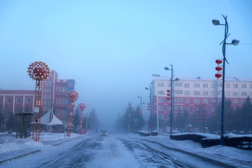 早晨7點30分,阿木爾林業(yè)局天剛蒙蒙亮,遠處的群山不見了蹤影,籠罩在寒霧當中,附近的建筑物影影綽綽,仿佛仙境一般,這種寒霧天氣被百姓成為“冒白煙”。