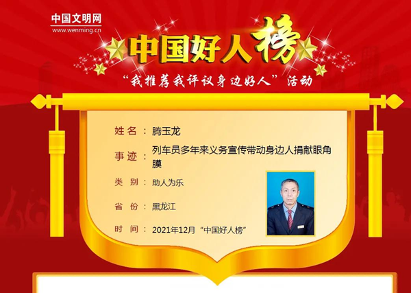 騰玉龍,鐵力市人,曾先后榮獲“龍江好人”“伊春好人”“最美鐵力人”等榮譽(yù)稱號(hào)。他曾多次捐贈(zèng)造血干細(xì)胞,挽救了3個(gè)人的生命。在他的帶動(dòng)下,他的家庭成為中國首個(gè)眼角膜、身體器官和造血干細(xì)胞捐獻(xiàn)志愿者家庭。騰玉龍同志入選2021年12月“中國好人榜”后,鐵力市精心組織策劃,動(dòng)員廣大干部群眾為典型點(diǎn)贊助力,組織全市各單位、各社區(qū)居民學(xué)習(xí)“中國好人”先進(jìn)事跡。