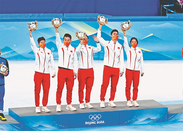 2月5日,中國隊(duì)選手在頒獎(jiǎng)儀式上。 黑龍江日?qǐng)?bào)全媒體特派記者 郭俊峰攝