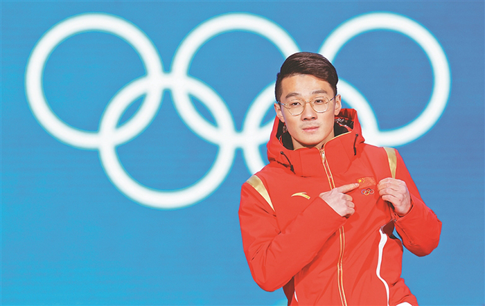 2月8日,冠軍中國隊選手任子威出席獎牌頒發(fā)儀式。當日,北京2022年冬奧會短道速滑男子1000米獎牌頒發(fā)儀式在北京賽區(qū)頒獎廣場舉行。新華社發(fā)