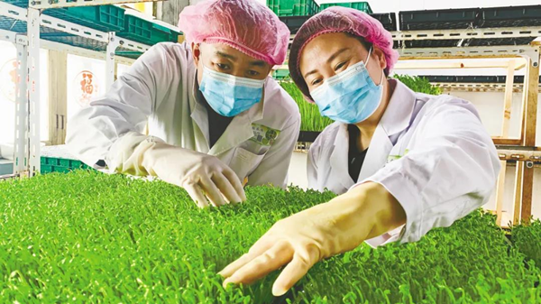 楊帆夫婦在查看芽苗菜長(zhǎng)勢(shì)。 姜立偉 攝