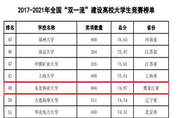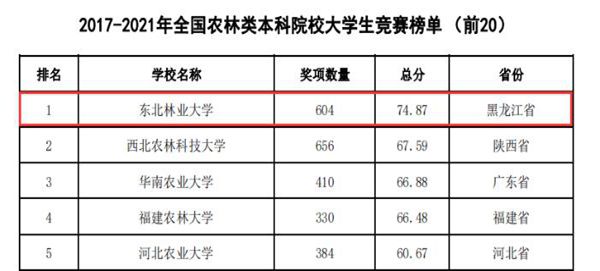黑龍江經(jīng)濟(jì)網(wǎng)訊(黑龍江日?qǐng)?bào)全媒體見(jiàn)習(xí)記者董廣碩 商祺)近日,中國(guó)高等教育學(xué)會(huì)高校競(jìng)賽評(píng)估與管理體系研究工作組發(fā)布2021全國(guó)普通高校大學(xué)生競(jìng)賽分析報(bào)告,在《2017-2021年農(nóng)林類本科院校大學(xué)生競(jìng)賽排行榜TOP20》中。東北林業(yè)大學(xué)以總分74.87(獲獎(jiǎng)604項(xiàng))的優(yōu)異成績(jī)連續(xù)四年蟬聯(lián)榜首。