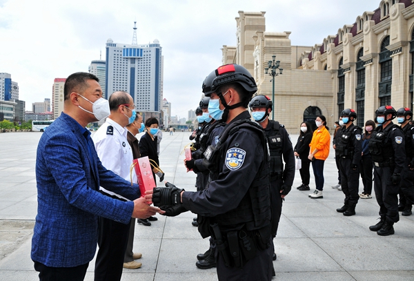 公益活動(dòng)首批慰問對(duì)象是剛從抗疫一線歸來的哈爾濱市公安局巡特警支隊(duì)隊(duì)員。本次疫情期間,他們馳援五常市拉林鎮(zhèn)、哈爾濱市平房區(qū)和賓縣,先后核查車輛3700余臺(tái),幫助群眾1100多人,為群眾配送餐食10萬余份、飲用水20余萬瓶、防疫物資9000余件,用血肉身軀筑起了抗擊疫情的鋼鐵長(zhǎng)城,詮釋了“疫情當(dāng)前,特警在先”的使命擔(dān)當(dāng)?!案兄x黑龍江日?qǐng)?bào)報(bào)業(yè)集團(tuán)和愛心企業(yè)送來健康產(chǎn)品。今后我們會(huì)一如繼往做好本職工作,哪里需要哪里上,當(dāng)好人民的忠誠(chéng)衛(wèi)士。”接過“小綠君”,哈爾濱市公安局巡特警支隊(duì)特警一大隊(duì)二中隊(duì)教導(dǎo)員劉甲洲一臉幸福。