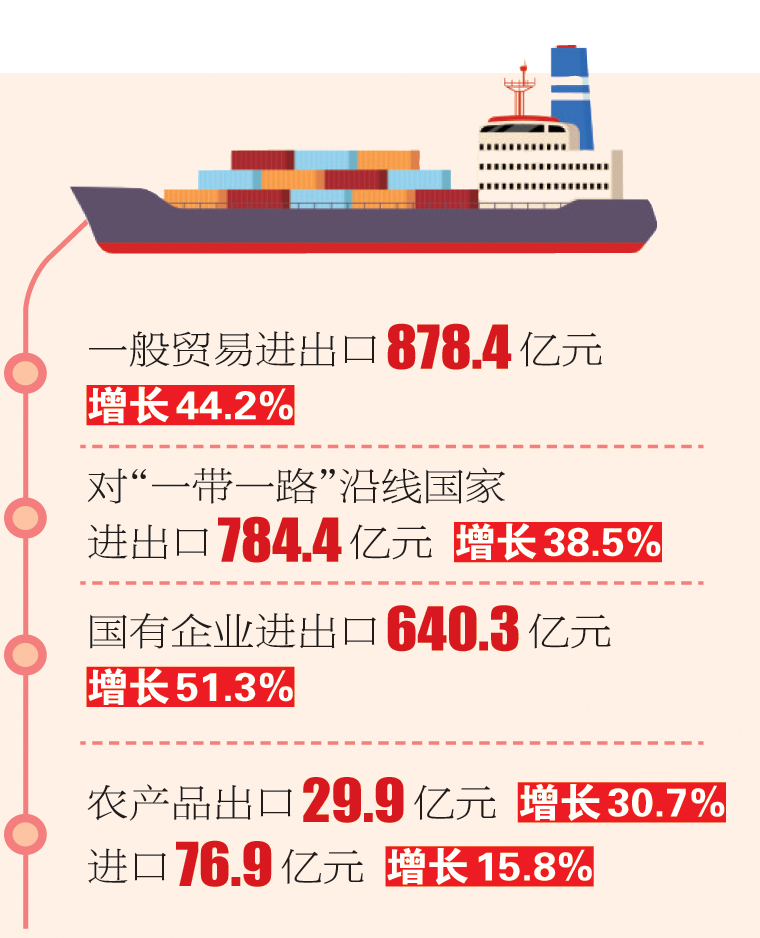 一般貿(mào)易進出口878.4億元,增長44.2%,占全省外貿(mào)總值的87.3%,比去年同期提升5.7個百分點。邊境小額貿(mào)易進出口80.3億元,增長1.6%,占全省外貿(mào)總值的8%。加工貿(mào)易進出口32.4億元,下降3.7%,占全省外貿(mào)總值的3.2%。
