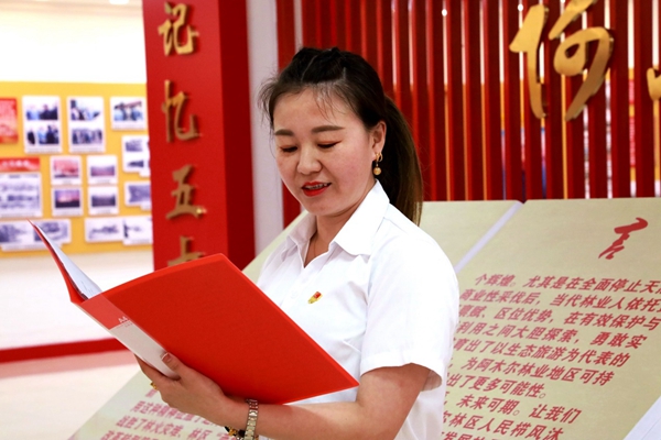 阿木爾林業(yè)局管理服務(wù)中心黨員杜淼在朗誦詩歌《七月的天空》(王力 攝)