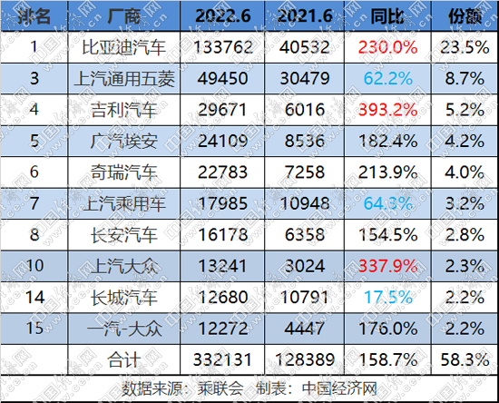 在乘聯(lián)會發(fā)布的6月新能源乘用車批發(fā)銷量廠商排名(TOP15)中,傳統(tǒng)品牌占據(jù)10席,共計銷售33.2萬輛,同比增長158.7%,市場份額接近六成,達到58.3%,1-6月,傳統(tǒng)品牌新能源累計銷售144.2萬輛,同比增長134.4%,份額同樣接近六成,為58.5%。