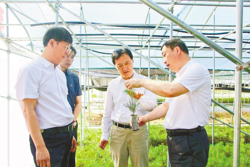 翟青(中)在伊春森工集團(tuán)公司紅松種苗繁育基地調(diào)研(劉博/攝)。