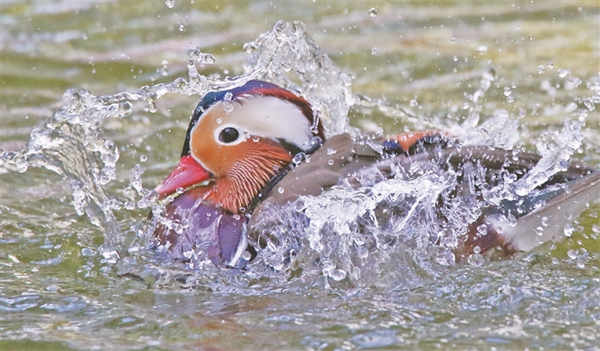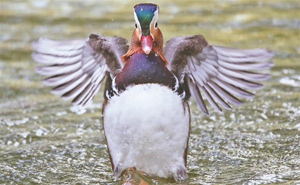 每天早晚,車春虎都會把準備好的麻籽、玉米、面包蟲等鳥食撒到湖上、岸邊,鴛鴦撒著歡覓食。吃完食兒,它們不時水上舒展羽翅,撲騰戲水,湖面上水花四濺,生機盎然。車春虎介紹,這些鴛鴦?wù)跒槟线w越冬做著體能儲備,每年10月中下旬它們就會離開繁殖地哈爾濱,飛到溫暖的南方越冬。