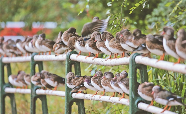 13日,哈爾濱市兆麟公園鴛鴦湖邊,近300只野生鴛鴦在湖邊欄桿上休息,密密麻麻排出近百米的“長龍”。公園專職看護鴛鴦的職工車春虎介紹,目前在公園內(nèi)及周邊出生的小鴛鴦已經(jīng)長大,加上從周邊濕地飛來的鴛鴦,每天早晚來鴛鴦湖覓食的鴛鴦數(shù)量接近300只,這一數(shù)量還在持續(xù)增長?!邦A計國慶節(jié)前后,數(shù)量能超400只?!?/span>