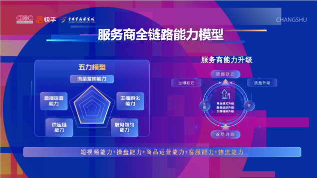 快手電商服務(wù)商則介紹了服務(wù)商全鏈路能力模型。針對(duì)商家主播能力弱、私域流量差、貨品不健全、投流ROI難提升等痛點(diǎn),服務(wù)商可以發(fā)揮流量營銷、直播運(yùn)營、主播孵化、供應(yīng)鏈、服務(wù)履約等全鏈路能力,助力商家冷啟孵化和躍遷。自今年3月底常熟服飾產(chǎn)業(yè)帶落地至今,快手服務(wù)商已服務(wù)500多個(gè)常熟商家,常熟當(dāng)?shù)乜焓謩?dòng)銷商家數(shù)提升30%+。