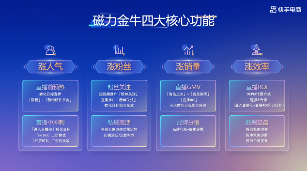本次活動(dòng),快手磁力金牛和快手電商服務(wù)商也宣布推出一系列政策,推動(dòng)常熟女裝商家電商生意增長(zhǎng)。作為電商生意的加速器,快手磁力金牛讓商家投流更精準(zhǔn)、效率更高、效果更好。在賬號(hào)啟動(dòng)期,商家可借助磁力金牛進(jìn)行私域起量,并根據(jù)貨盤制定營銷策略;在賬號(hào)成長(zhǎng)期,商家可依據(jù)S-A-B直播策略模型,使用磁力金牛進(jìn)行差異化投流、精細(xì)化運(yùn)營;在賬號(hào)成熟期,磁力金??梢栽谄沸f(xié)同下進(jìn)行差異化拓客,引入新流量。