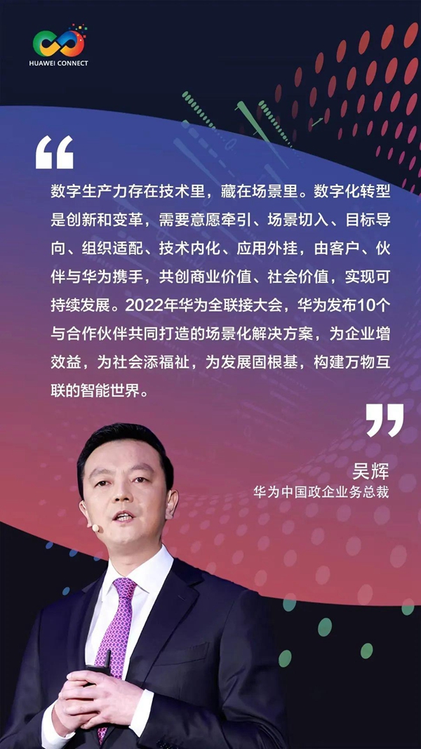 當(dāng)前,我國的數(shù)字化已經(jīng)進(jìn)入快車道,釋放數(shù)字生產(chǎn)力正當(dāng)其時。而“數(shù)字生產(chǎn)力就存在技術(shù)里,藏在場景里?!被诖?,華為中國政企業(yè)務(wù)總裁吳輝在會上發(fā)表了題為《為行業(yè)找技術(shù),深入場景創(chuàng)造價值》的主題演講,重點分享了華為基于多年的探索和實踐總結(jié)出的行業(yè)數(shù)字化轉(zhuǎn)型的方法論和企業(yè)轉(zhuǎn)型成功秘訣。