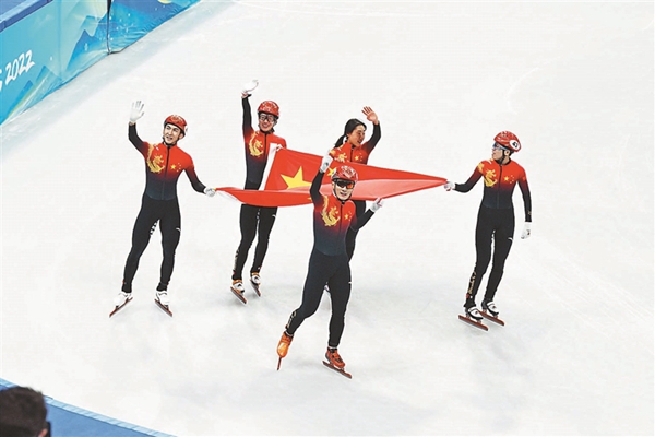 北京冬奧會(huì)短道速滑混合團(tuán)體接力中國隊(duì)摘金。
