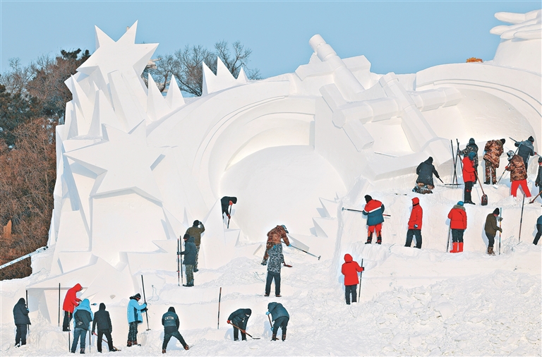 本報訊(記者 劉艷)記者從哈爾濱市太陽島風景區(qū)獲悉,13日,第35屆哈爾濱太陽島雪博會大型主塑《逐夢》正式開鏟。主塑長100米,高33米,將由70余位雕刻師用一周左右的時間完成,用雪量近2.6萬立方米。