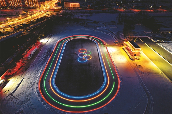 日前,雞西市橋北體育場大型燈光速滑冰場亮相并投入使用。冰場上,紅、綠、藍(lán)、黃四條光帶分隔的速滑賽道美麗且醒目。在冰場的中央,由五色光帶構(gòu)成的奧運(yùn)五環(huán)標(biāo)志清晰明亮,冰場四周懸掛了1000個小燈籠。燈光錯落有致,色彩斑斕,吸引了大量市民加入到夜滑隊(duì)伍中。楊春光 本報記者 孫偉民攝