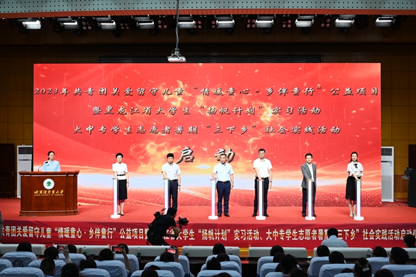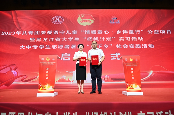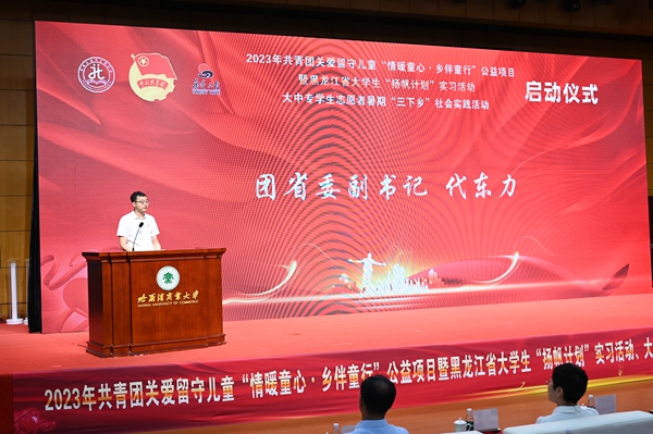 黑龍江經(jīng)濟(jì)網(wǎng)訊(王丹陽(yáng) 記者祝東)7月5日,2023年共青團(tuán)關(guān)愛(ài)留守兒童“情暖童心·鄉(xiāng)伴童行”公益項(xiàng)目暨黑龍江省大學(xué)生“揚(yáng)帆計(jì)劃”實(shí)習(xí)活動(dòng)、大中專學(xué)生志愿者暑期“三下鄉(xiāng)”社會(huì)實(shí)踐活動(dòng)啟動(dòng)儀式在哈爾濱商業(yè)大學(xué)隆重舉行。共青團(tuán)黑龍江省委副書(shū)記代東力、陳海平,哈爾濱商業(yè)大學(xué)副校長(zhǎng)姜國(guó)峰,省直機(jī)關(guān)團(tuán)工委書(shū)記趙明瑞,黑龍江省人力資源和社會(huì)保障廳、省知識(shí)產(chǎn)權(quán)局、省人民檢察院、省青少年發(fā)展基金會(huì)、哈爾濱市南崗區(qū)民政局、哈爾濱海關(guān)、哈爾濱海事局相關(guān)領(lǐng)導(dǎo),以及哈爾濱商業(yè)大學(xué)的志愿者和哈爾濱市樂(lè)業(yè)小學(xué)師生代表參加本次活動(dòng)。