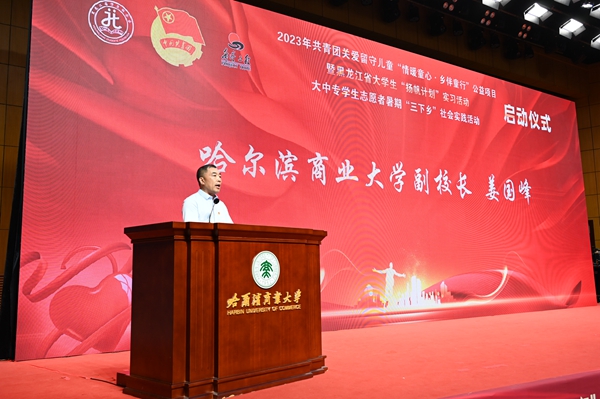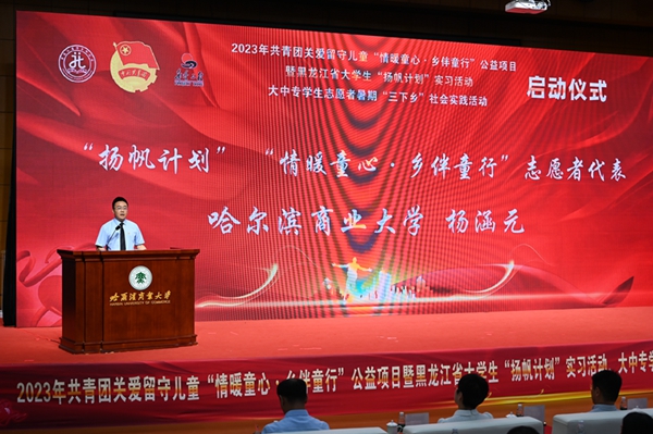 本次活動(dòng),在哈爾濱商業(yè)大學(xué)的大力支持下順利開(kāi)展,哈爾濱商業(yè)大學(xué)副校長(zhǎng)姜國(guó)鋒在儀式上致辭,他說(shuō):“學(xué)校建校71年來(lái),立足立德樹(shù)人根本任務(wù),聚焦‘為黨育人,為國(guó)育才’的職責(zé)使命,在不斷加強(qiáng)‘第一課堂’建設(shè)的同時(shí),還依托學(xué)?!惑w兩翼’文化育人模式,充分發(fā)揮實(shí)踐育人的作用,通過(guò)開(kāi)展‘三下鄉(xiāng)’‘返家鄉(xiāng)’等社會(huì)實(shí)踐和‘西部計(jì)劃’‘興邊富民’志愿服務(wù)項(xiàng)目,引導(dǎo)廣大青年學(xué)生堅(jiān)持用習(xí)近平新時(shí)代中國(guó)特色社會(huì)主義思想凝心鑄魂,在社會(huì)的課堂中‘受教育、長(zhǎng)才干、作貢獻(xiàn)’?!被顒?dòng)現(xiàn)場(chǎng),播放《黑龍江省希望工程30年與光同行》和黑龍江省大中專學(xué)生志愿者暑期“三下鄉(xiāng)”社會(huì)實(shí)踐活動(dòng)宣傳片,與會(huì)領(lǐng)導(dǎo)上臺(tái)共同啟動(dòng)了“情暖童心·鄉(xiāng)伴童行”公益項(xiàng)目、大學(xué)生“揚(yáng)帆計(jì)劃”實(shí)習(xí)活動(dòng)、大中專學(xué)生志愿者暑期“三下鄉(xiāng)”社會(huì)實(shí)踐活動(dòng)。