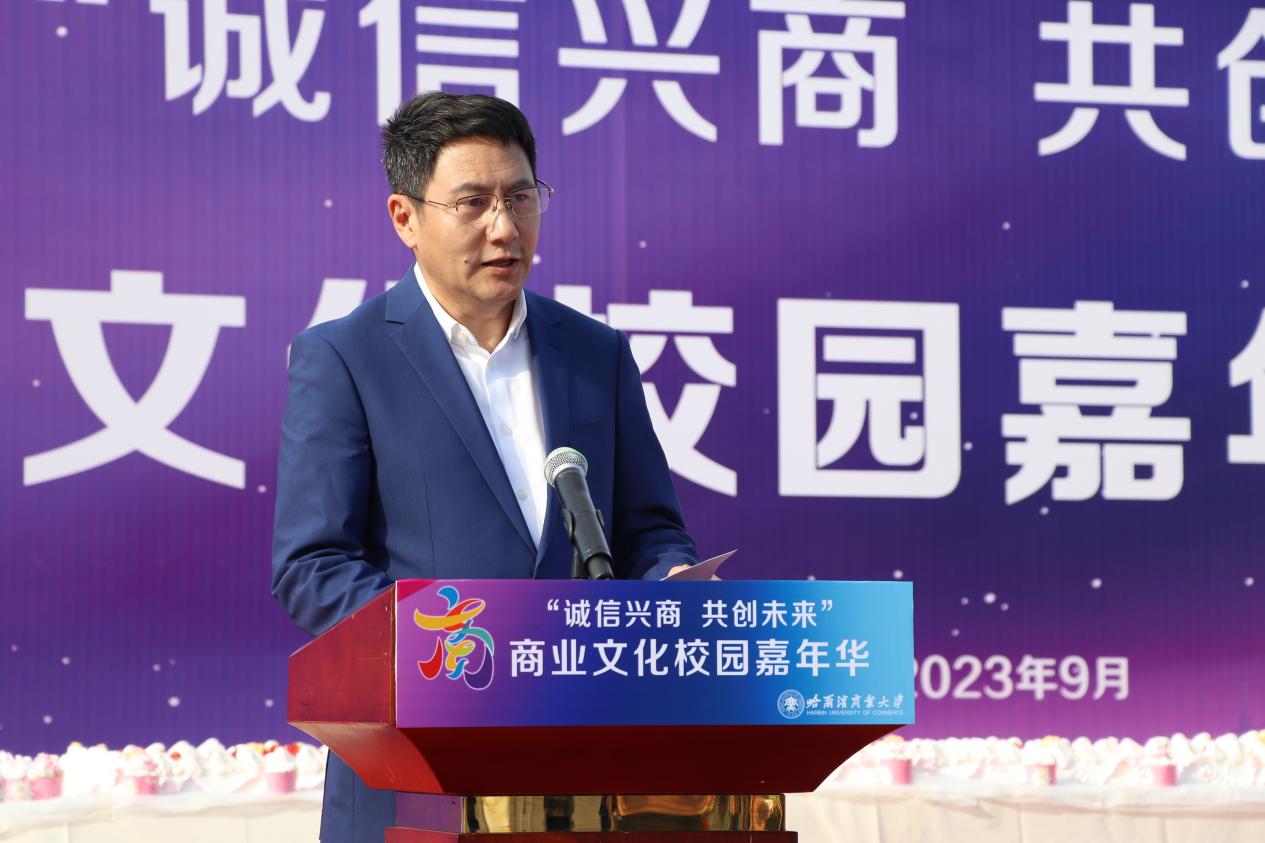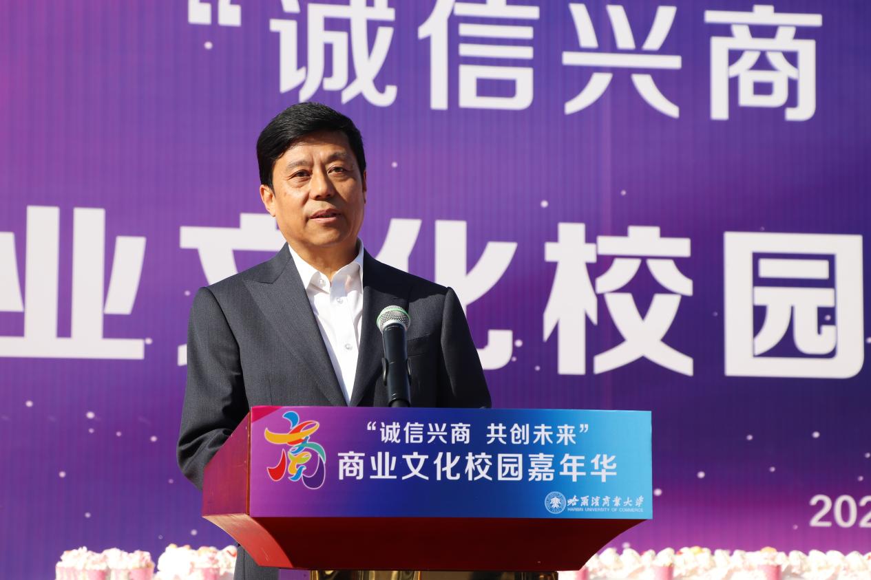 哈爾濱商業(yè)大學黨委書記孫先民致辭。他表示,誠信“軟實力”為高質量發(fā)展提供“硬支撐”。本屆“誠信興商·共創(chuàng)未來”商業(yè)文化校園嘉年華活動堅持以文化力量啟智潤心、固本培元,是深入學習貫徹習近平總書記在主持召開新時代推動東北全面振興座談會和視察我省時的重要講話重要指示精神,全面落實立德樹人根本任務的務實舉措。哈爾濱商業(yè)大學作為新中國第一所多科性商業(yè)大學,始終堅持“大商鑄才、大雅育人、商雅兼?zhèn)?、經世濟民”的育人理念,厚植師生“心懷祖國,至誠奉獻,以商弘業(yè),矢志一流”的大商之道?;顒訉⒊浞职l(fā)揮老字號在文化引領、品牌建設、產業(yè)升級等方面的示范引領作用,彰顯龍江市場主體活力與創(chuàng)新力,聚焦建設“六個龍江”、推進“八個振興”,筑牢堅定龍江文化繁榮發(fā)展的自信根基,進一步凝聚師生扎根龍江、服務龍江、建設龍江的情懷和力量。