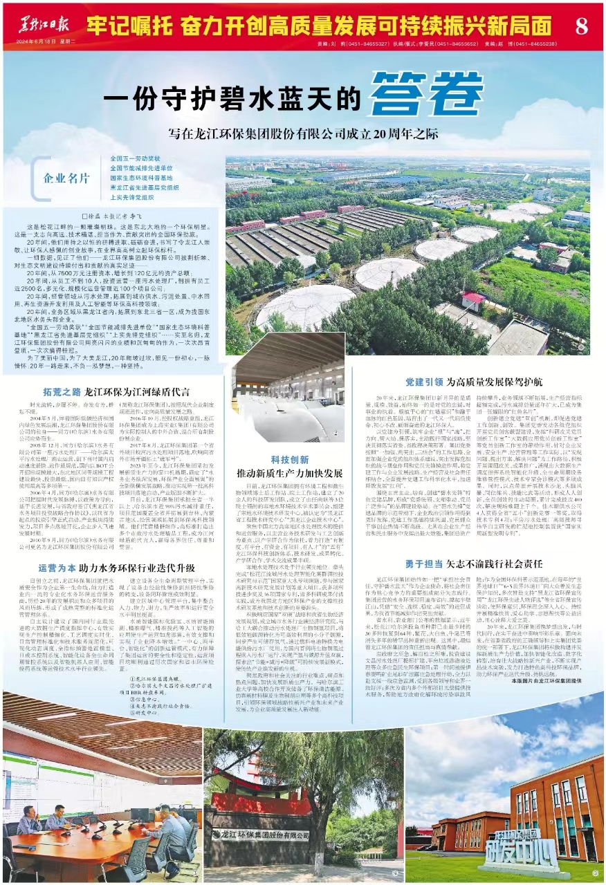 20年間,他們用持之以恒的拼搏進(jìn)取、砥礪奮進(jìn),書寫了令龍江人崇敬、讓環(huán)保人感佩的創(chuàng)業(yè)故事,在業(yè)界高高樹立起環(huán)保標(biāo)桿。