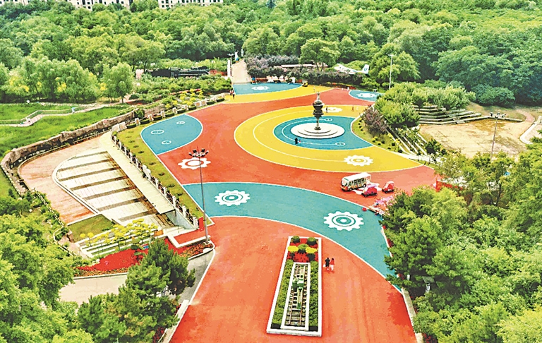 公園內(nèi)4000多平方米的休閑廣場,經(jīng)過改造、彩化,呈現(xiàn)出全新的面貌,孩子們在上面騎車、奔跑。彩色廣場將工業(yè)主題元素融入設計理念,與周圍的景觀小品相得益彰。
