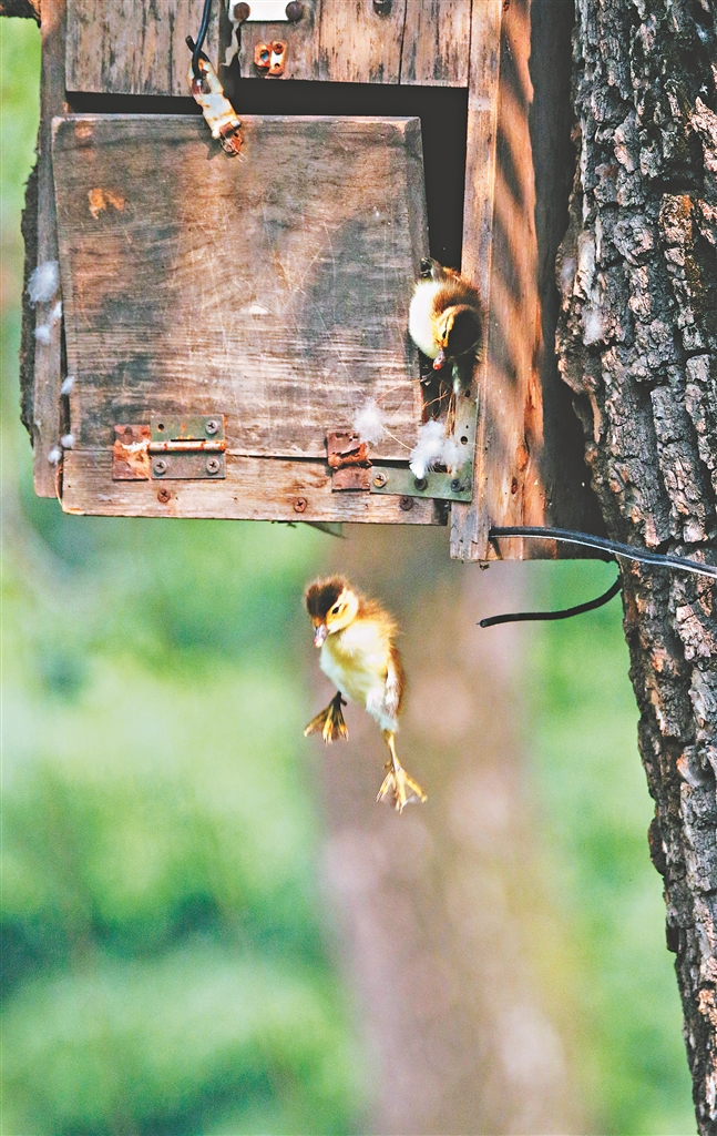 當(dāng)13只小鴛鴦跳完,最后一只卡在木頭縫隙中遲遲下不來,鳥媽媽帶著其他孩子在鴛鴦池塘上焦急地向巢上眺望,不時(shí)發(fā)出“咳、咳”的叫聲,召喚它快些跳下來。在一番“手蹬腳刨”后,這只身體有些單薄的小家伙終于掙脫而出,飛身躍到池塘邊的臺(tái)階上,然后再躍身跳到池塘里游到媽媽身邊。