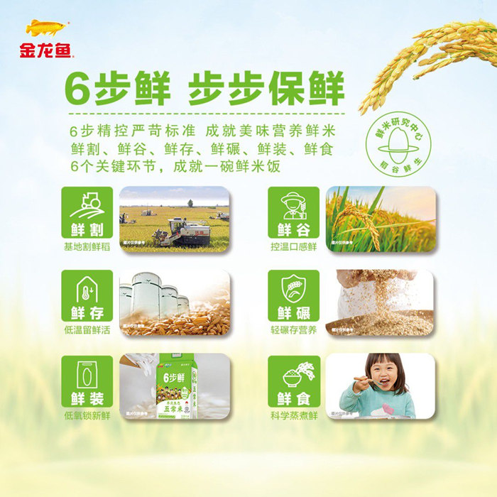 金龍魚的成績,離不開其長期以來對“新質生產(chǎn)力”的深耕,金龍魚采用的稻谷6步鮮米精控技術,便是科技創(chuàng)新在農(nóng)業(yè)領域的生動體現(xiàn)。在“鮮割、鮮谷、鮮存、鮮碾、鮮裝、鮮食”的各關鍵環(huán)節(jié)上,實現(xiàn)了田間到餐桌的全鏈路保鮮,也為稻谷的基因檢測、降低水分、科學存儲、適度加工、即碾即裝等重要階段提供了嚴苛保障。