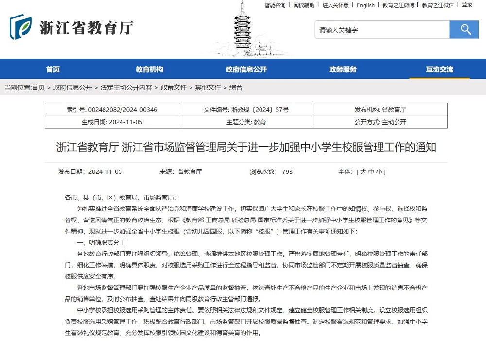 作為服裝產(chǎn)業(yè)發(fā)達(dá)省份,浙江省一直注重校服質(zhì)量。如2014年浙江省教育廳聯(lián)合浙江省質(zhì)量技術(shù)監(jiān)督局發(fā)布《關(guān)于進(jìn)一步加強(qiáng)學(xué)生服裝和床上用品管理工作的通知》;2018年,浙江省質(zhì)監(jiān)局聯(lián)合教育廳、工商局聯(lián)合發(fā)布了《浙江省學(xué)生服質(zhì)量提升行動工作方案》;2022年10月,浙江省《教育收費(fèi)政策(2022年)》規(guī)定學(xué)校收取服務(wù)性收費(fèi)和代收費(fèi),堅(jiān)持學(xué)生自愿和非營利原則,不得與學(xué)費(fèi)、住宿費(fèi)合并統(tǒng)一收取,不得從中牟利。