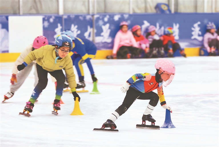 2日,哈爾濱市道里區(qū)冰上運動中心氣膜冰場內(nèi),百余名中小學生正在練習滑冰。