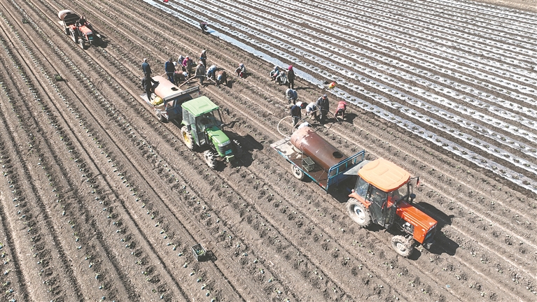 通往新華鄉(xiāng)的道路兩側(cè),儼然一幅動(dòng)態(tài)的農(nóng)事畫卷:拖拉機(jī)“突突”作響,拉著水罐在田壟間穿梭;菜農(nóng)們分工默契,有人鋪設(shè)地膜,白色薄膜在黑土地上延展成浪;有人彎腰移栽,鮮嫩菜苗被小心植入土中;有人手持水管緊隨其后,清水汩汩滋潤著新苗。覆膜、栽苗、澆水,動(dòng)作連貫流暢,田埂間回蕩著農(nóng)具與泥土的碰撞聲,交織成初夏最生動(dòng)的勞作交響。