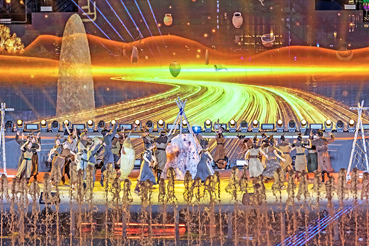 夜幕降臨,松花江江面瞬間化作光影的畫布。彩排現(xiàn)場,水幕、噴泉、激光秀、無人機等特效輪番登場,交相輝映;光影與旋律交織,歷史故事通過鮮活的影像在觀眾眼前徐徐展開。演員們精湛的表演,配合著“人、聲、光、水、電、影、景”的深度融合,讓整個演出現(xiàn)場充滿了震撼力與感染力。