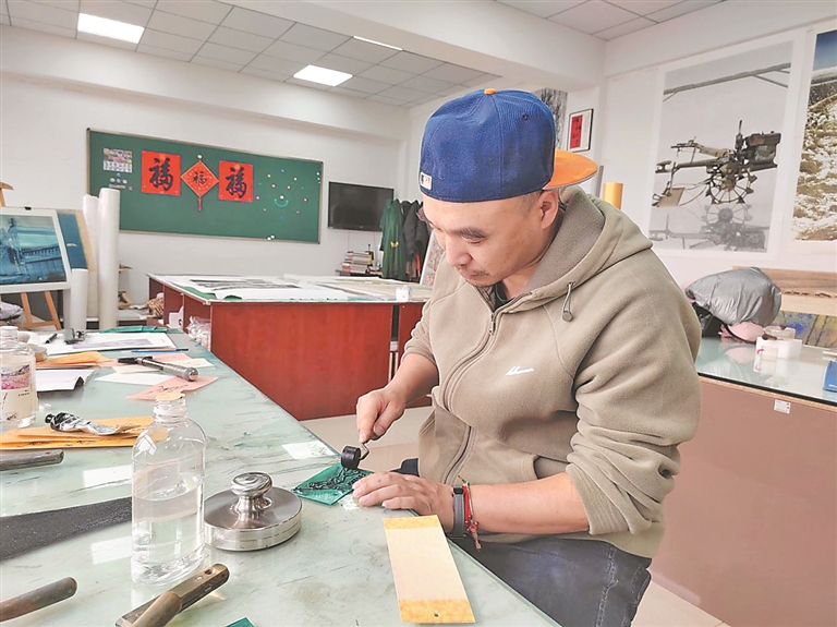 慶安版畫是黑龍江省非物質(zhì)文化遺產(chǎn)代表性項(xiàng)目,始于20世紀(jì)初。創(chuàng)始人吳盡臣將河北樂(lè)亭的木刻技藝帶到這片黑土地,最初以雕刻門神、福字等民俗圖案為主題,突出節(jié)日的喜慶和吉祥氣氛,表達(dá)人們對(duì)美好未來(lái)的企盼和追求。20世紀(jì)60年代中期,幾位著名的北大荒畫家到慶安工作,精心指導(dǎo)民俗年畫作者創(chuàng)作版畫,將慶安民俗版畫和北大荒版畫創(chuàng)作相互交融。歷經(jīng)四代傳承,吳蔚的父親吳玉林將題材拓展,用細(xì)膩刀法展現(xiàn)慶安的春播秋收、田園生活,在傳承中不斷創(chuàng)新;而吳蔚則把冰雪元素融入版畫創(chuàng)作,將千里冰封的壯美轉(zhuǎn)化為木板上的立體紋理?!袄献孀诹粝碌募妓嚥荒軄G,但作品題材和技法也要與時(shí)俱進(jìn),推陳出新?!眳俏当硎?,他們的創(chuàng)作團(tuán)隊(duì)不僅深入田間地頭、林海雪原采風(fēng),用刻刀記錄黑土地的獨(dú)特風(fēng)情,也緊盯時(shí)事熱點(diǎn),呈現(xiàn)新時(shí)代的主流價(jià)值。
