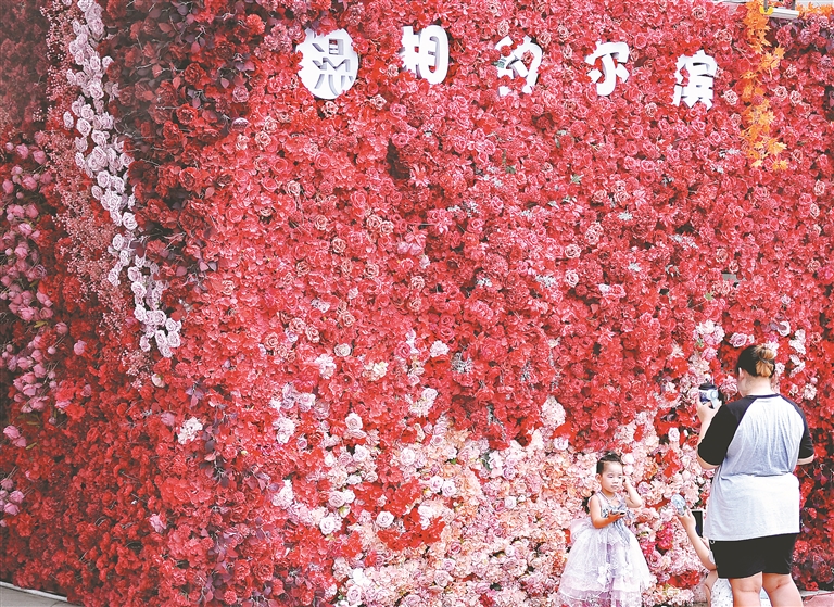 近日,哈爾濱市建筑藝術廣場上,游客們在新景觀前打卡拍照。這些景觀有彩繪墻壁,有花卉構成的圖案,還有裝扮一新的商亭。它們構思新穎,造型獨特,成為廣場上的新亮點。